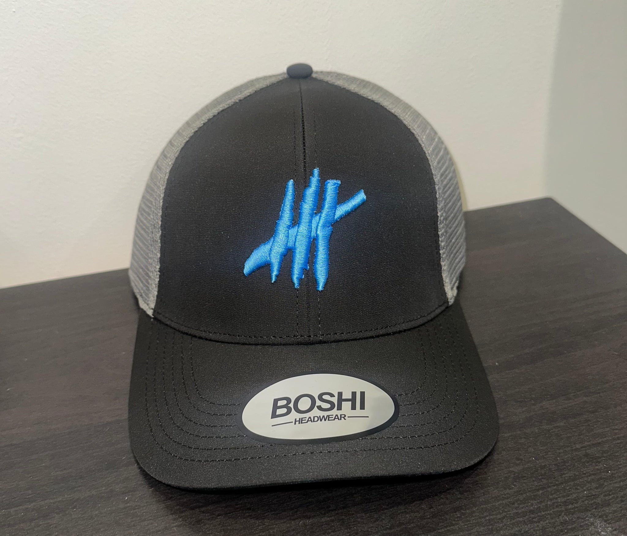• Load image into Gallery viewer, New Black & grey trucker cap with light blue logo